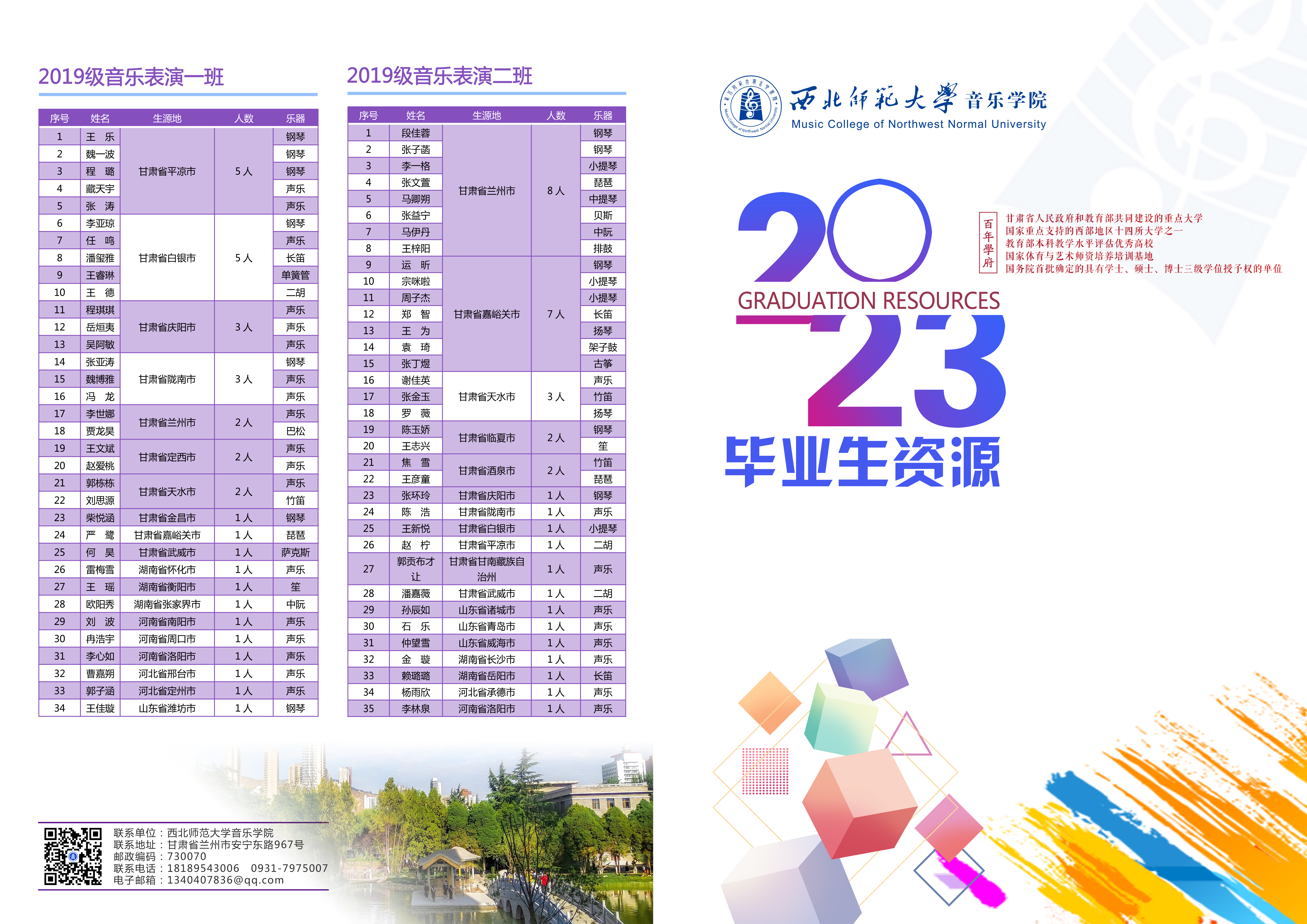 一、硕士研究生63人;音乐与舞蹈学16人;艺术硕士(音乐)46人;教育硕士(学科教学音乐)1人。音乐与舞蹈学:钢琴教学与演奏方向1人;音乐与舞蹈学:中国传统音乐研究方向2人;音乐与舞蹈学:中国音乐史研究方向2人;音乐与舞蹈学:西方音乐史研究方向4人;音乐与舞蹈学:影视音乐研究方向2人;音乐与舞蹈学:作曲与作曲技术理论方向1人;音乐与舞蹈学:音乐教育研究方向3人;音乐与舞蹈学:音乐美学研究方向1人;艺术硕士(音乐)音乐教育方向22人;艺术硕士(音乐)声乐演唱方向11人;艺术硕士(音乐)键盘器乐演奏方向7人;艺术硕士(音乐)作曲方向6人。二、本科毕业生123人音乐学(音乐教育)专业人:54人声乐方向22人;钢琴11人;二胡2人音乐表演专业69人:声乐方向27人;钢琴12人欢迎各用人单位选用公司毕业生!联系电话研究生:0931-7971894 朱老师本科生:0931-7975007 18189543006 马老师公司办公室:0931-7975585 王老师