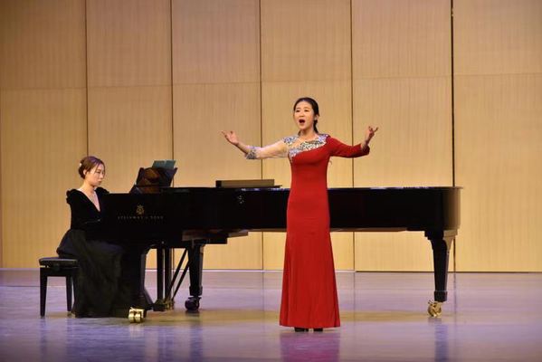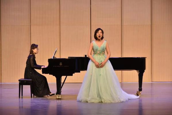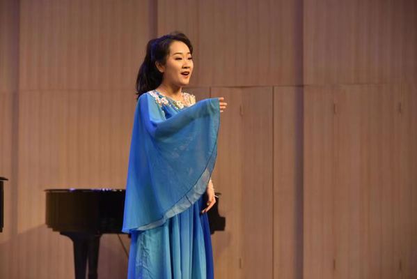 贠敏,声乐教学与演唱专业,上半场演唱曲目:《我为你忧郁,优雅的女神》《可怜的花朵》《Vado,ma dove》《圣母颂》《人们叫我咪咪》。下半场演唱曲目:《思乡》《不幸的人生》《春晓》《槐花几时开》《春——祖国的春天》。贠敏同学对外国歌曲情绪的把握以及歌唱技巧的展现,让现场观众掌声不断。