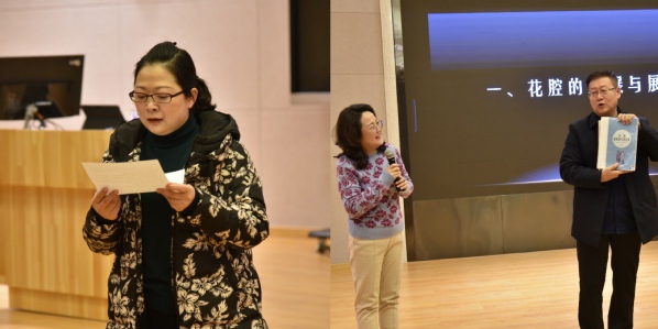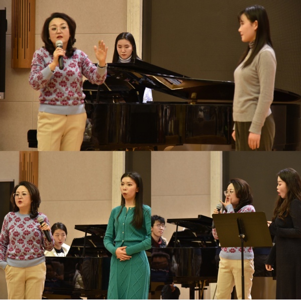首先,陶英教授向大家介绍了花腔的定义、源起、发展,阉人歌手以及不同时期的著名花腔歌唱家。其次,陶英教授以花腔演唱的技法介绍为核心,讲解了跳音、倚音、波音、回音、颤音、华彩经过句、自由华彩乐段等多种技法,并用《玛依拉变奏曲》《踏雪寻梅》《牧笛》《我愿生活在美梦中》《我听见他的声音》等不同民族、不同风格的作品来进行具体阐释。第三部分,陶英教授为大家介绍了自己的演出团队以及演出经历。