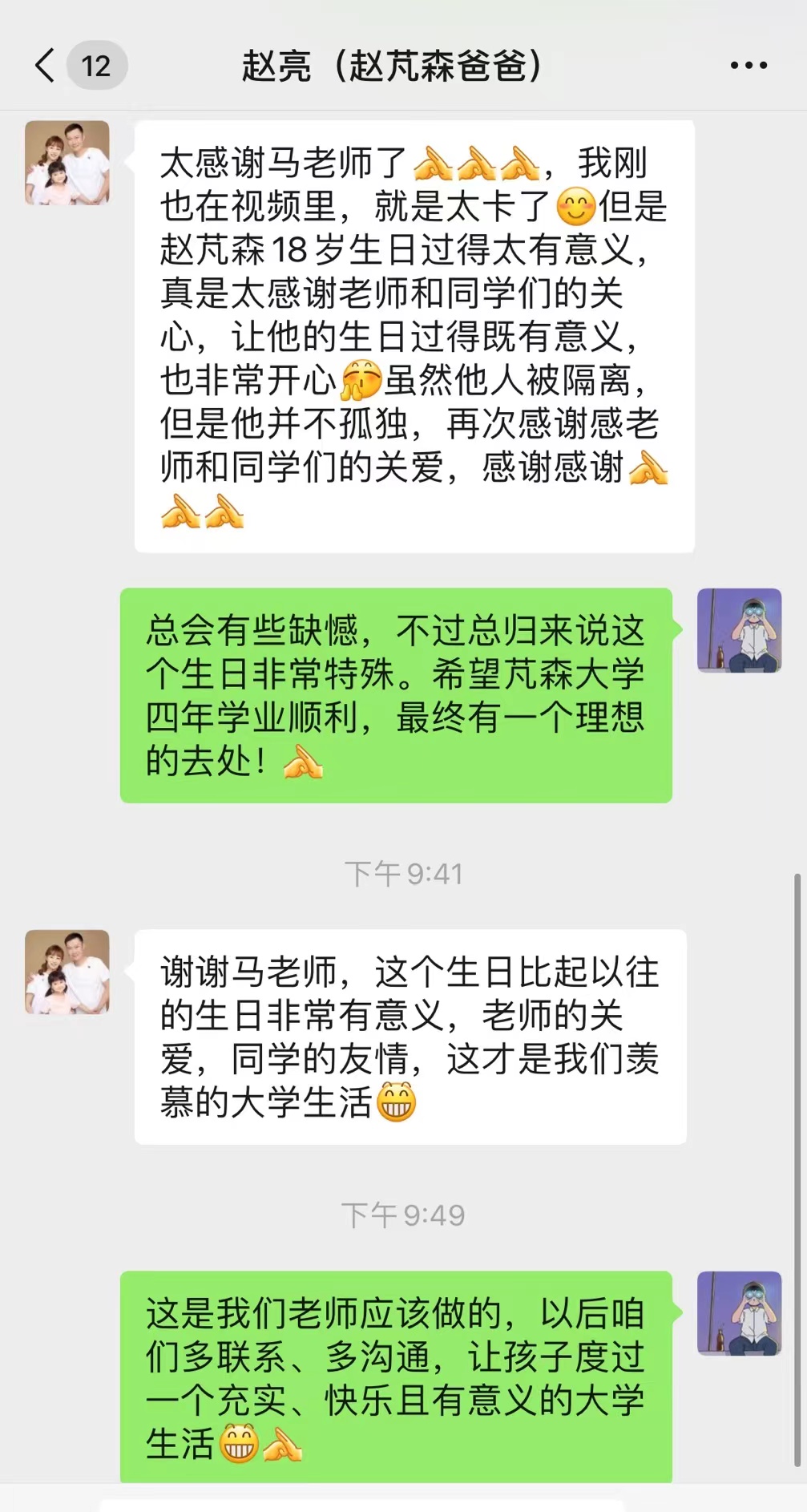 “没想到疫情隔离期间,还有这么多老师和同学为我过生日,我将终身难忘,谢谢大家的祝福!谢谢公司的关心!”赵芃森感动地说。赵芃森的父亲也应邀参加了线上庆生活动,他感慨地说:“虽然芃森被隔离了,但是他并不孤独,有老师的关爱,有同学的关心……这个生日比起以往的生日更有意义,这才是我们羡慕的老员工活!”