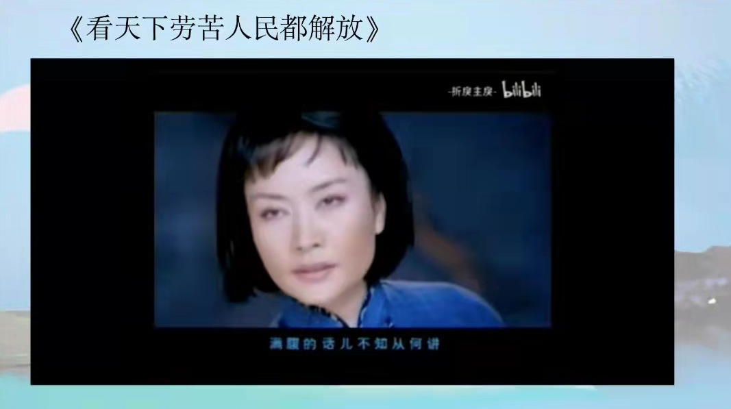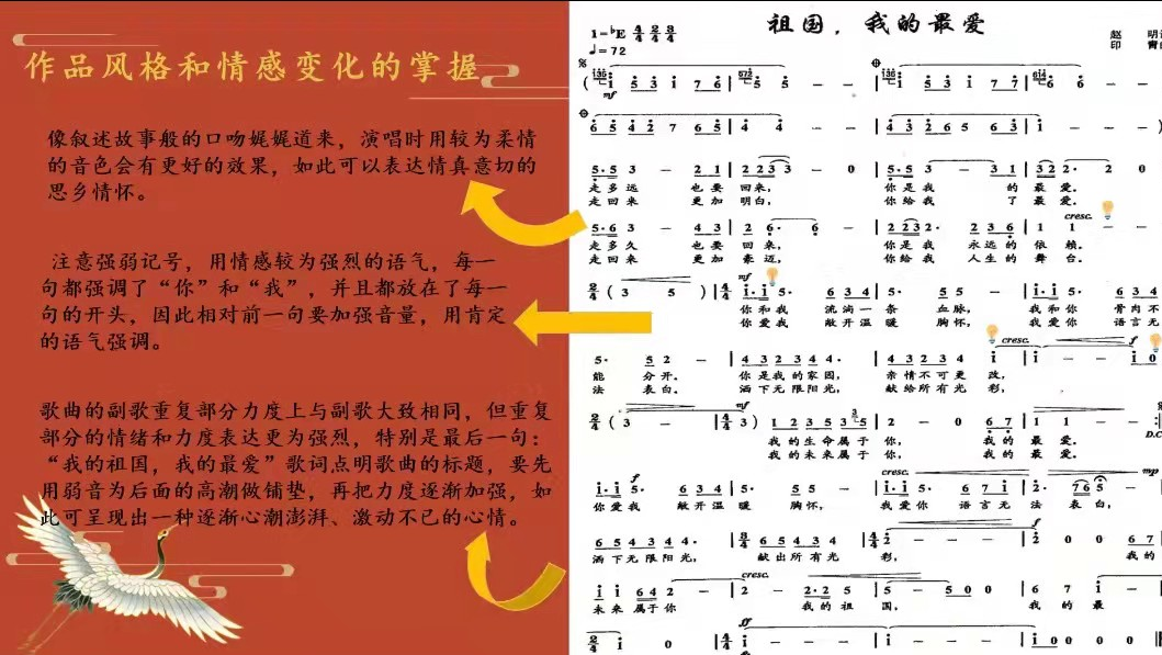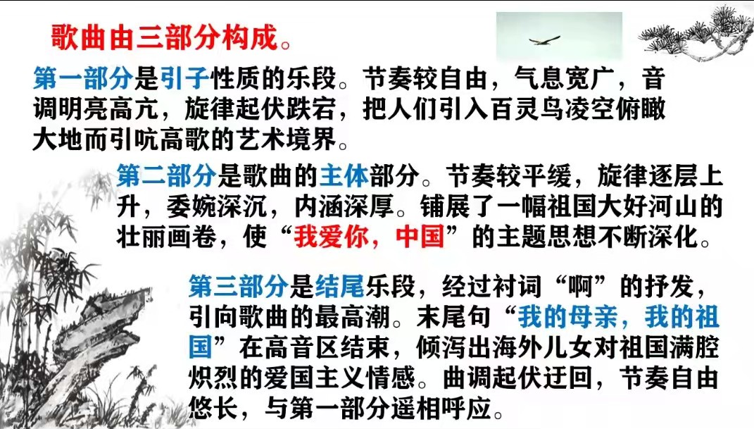 《我爱你.中国》是电影《海外赤子》的主题曲。冉明同学重点从歌词与文学结合的角度为我们讲解。这首歌的歌词采用中国传统诗词“赋比兴”的表现手法,对祖国的自然风光做了形象的描写和细腻的刻画。高音如汹涌的海浪真挚热烈,低音部分似潺潺的溪水舒缓含蓄,通过声情并茂的演唱,唱出了对祖国浓烈的热爱。