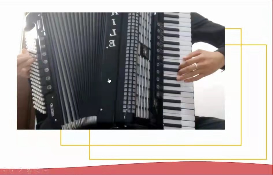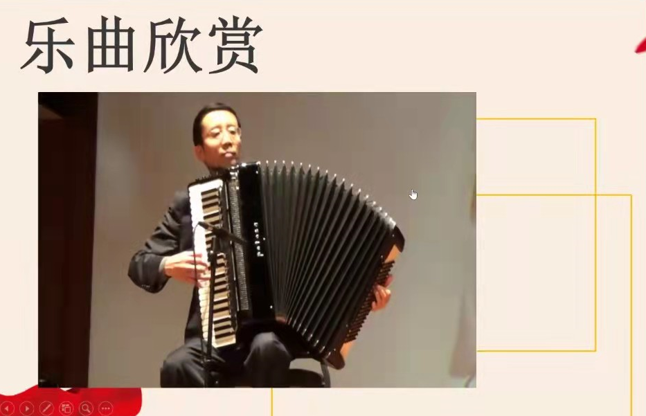 手风琴曲《牧民之歌》是一首以内蒙民歌《牧民歌唱毛主席》为主题而创作的独奏曲。杨刚同学从创作背景,乐曲分析,乐曲欣赏这三个角度为大家进行了精彩讲解。乐曲欢快自豪,深情优美,为三部曲式结构,层次丰富。演奏中大量切分音节奏的运用使人身临其境地感受到辽阔的大草原上骏马奔驰的场景,表现出祖国万物的勃勃生机。