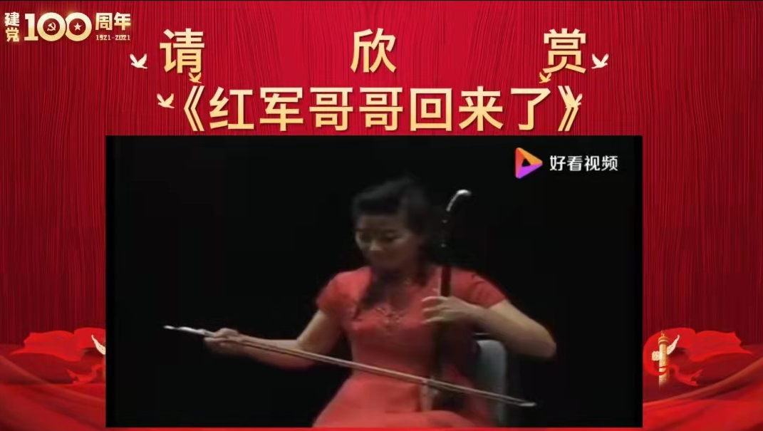 《红军哥哥回来了》是由张长城、原野于1958年一起合作的板胡独奏曲。以陕西地方戏曲“碗碗腔”音乐为素材改编而成。赵越同学以边讲解边示范演奏的形式展开自己的讲座。演奏中欢腾的快板和柔和的慢板交替演奏,生动描绘了陕北人民欢迎抗日红军凯旋归来的景象,表达出军民之间的鱼水深情。