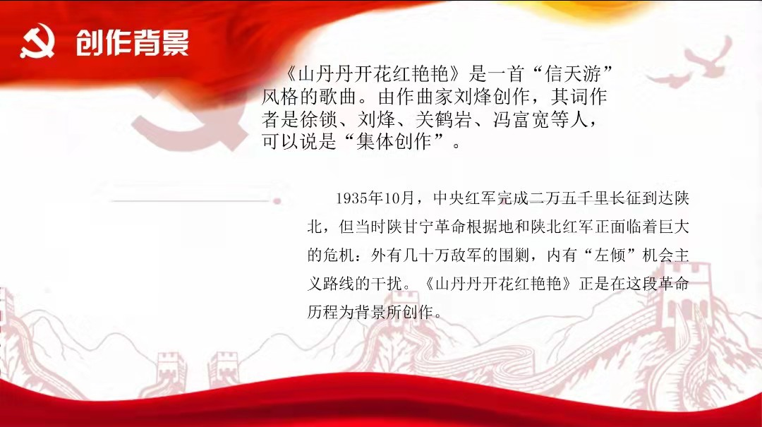 经改编的二胡曲《山丹丹开花红艳艳》是以五声调式作为基础。边远清同学着重对这首曲子的速度、力度处理进行了讲解。音乐旋律悠长、曲调高亢明亮,演奏中多次变化弓法,前后情感交替强烈而明显。作品以陕北民歌作为表现形式,用西北人民的语言和形象热情歌颂了毛泽东带领中央红军到达陕北取得的丰功伟绩。从中也使现场观众领略到西北人民淳朴豪放的性格。