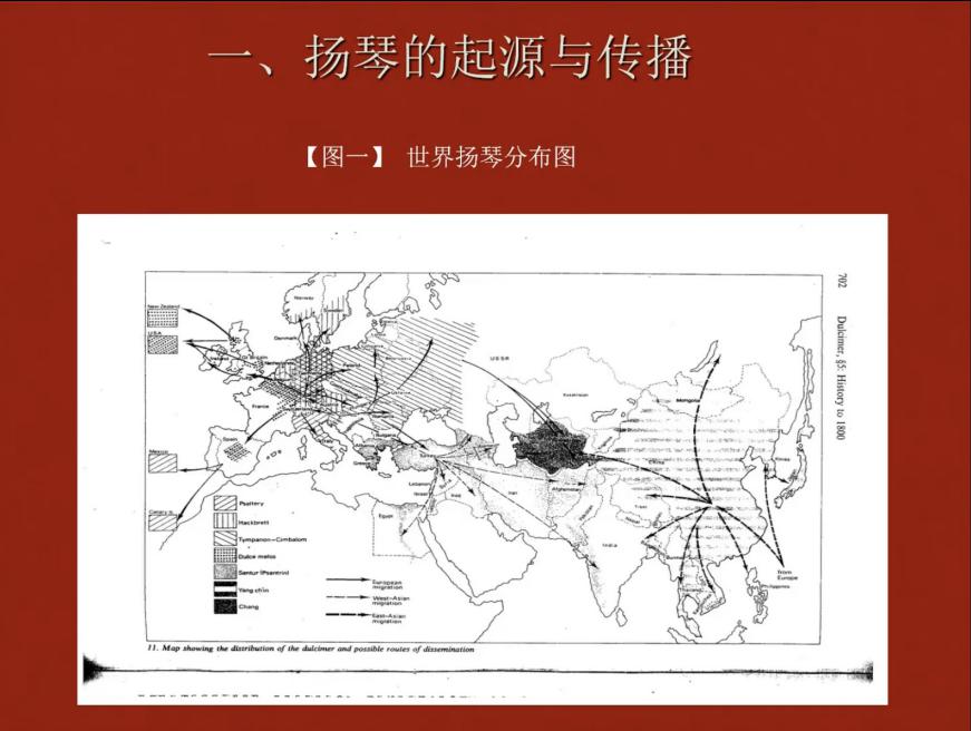 扬琴遍及五大洲,全世界有50多个国家都有扬琴这件乐器。关于扬琴最早的图像出现在公元12世纪一本古书的封面。扬琴历史悠久,分布广阔,历经上千年历史,在各国的音乐文化中有着极其特殊的地位,并发挥着重要的作用。