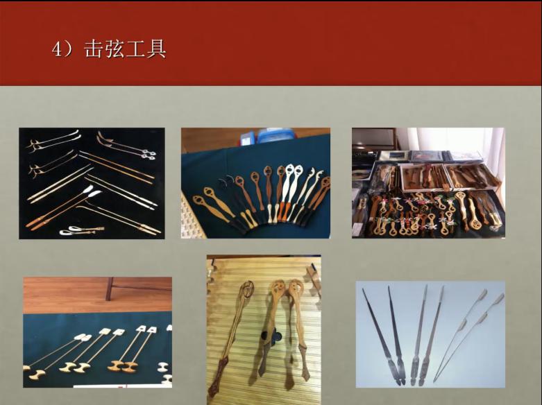 击弦工具是扬琴不可或缺的重要组成部分,琴槌的样式多种多样,外国扬琴的击弦工具统称为琴槌,大多为木质。中国扬琴的击弦工具别具一格,被称为“琴竹”,用竹子制成。