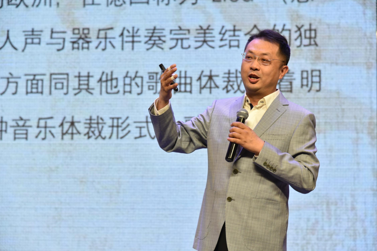 中国声乐分为很多类别,有美声、民族、流行、原生态等,它们都有属于自己的文化,而艺术歌曲的最大特点之一在于它的歌词基本都是诗词歌赋。本场通识课由理论部分和艺术实践两部分构成。朱师臣老师在理论部分为大家详细讲述了艺术歌曲的概念、诞生背景、发展过程,以及作曲家的生平。