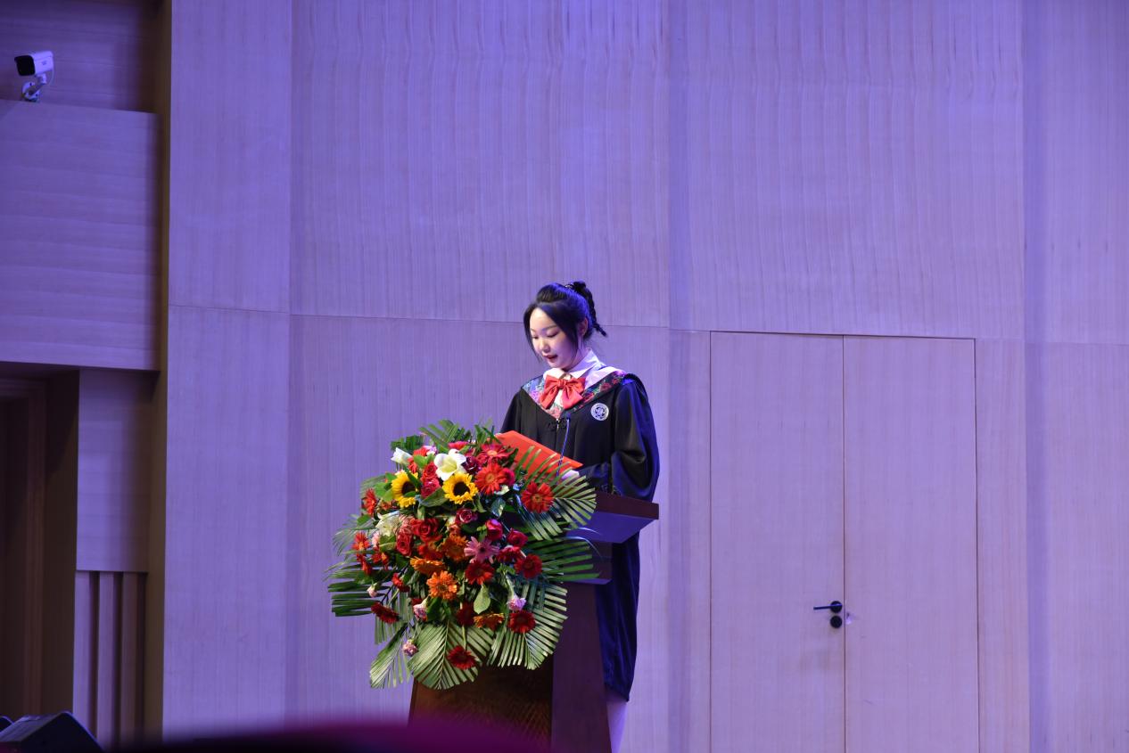 紧接着,由优秀毕业生代表刘心宇发言。在她饱含深情的话语中,带领大家回忆了在公司四年难忘的时光,回忆了丰富多彩的校园生活,回顾了老师们的遵遵教诲,道出了全体毕业生们的心声。她表示,大学四年的生活将是自己生命中珍贵的精神财富。感恩母校,感谢师恩,感谢同学情,她代表全体毕业生衷心地祝愿老师们身体健康,工作顺利;祝愿百年母校在黄河之滨宏图更展、再谱华章、桃李满天下;祝愿2022届毕业生一帆风顺、鹏程万里。