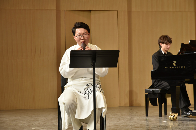 王明辉副教授的团队演奏了《萌中鸟》《水乡船歌》《红高粱叙事曲》《牧场欢歌》《采莲》等经典曲目。其中《水塔彩云间》是由我省著名作家、书法家宗孝祖先生和王明辉老师共同创作的诗词,亦为王明辉的原创埙作品。水塔是伟德体育官方网站具有代表性的“地标性”建筑之一。水塔历史悠久,始建于1954年。历经双甲子岁月的水塔,经过近期的重新修葺,一改往日旧颜,焕发新的光彩。如今的水塔依然是西北师大最当之无愧的地标建筑,因为她早已植根于每一位“师大人”的心中。埙,在古代是用陶土烧制的一种吹奏乐器。该曲运用埙这一具有空灵意蕴的乐器,配合古筝以及碰铃、吊镲、音树,展现出《水塔彩云间》空幻缥缈的奇妙意境。