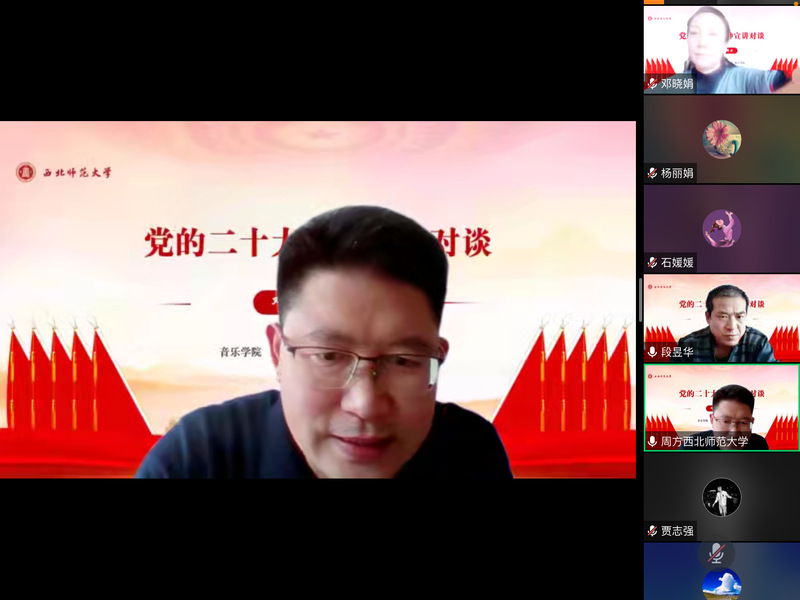 音乐、美术、体育、舞蹈公司8位党委委员、系所中心主任、党支部书记、教师代表积极对谈交流学习宣传贯彻党的二十大精神心得体会。老师们纷纷表示,学习宣传贯彻党的二十大精神要加大团队队伍建设力度,加强师德师风、艺德艺风建设,坚定以人民为中心的立场,守住为人民服务的初心,把为人民服务作为文艺工作者的天职,把人民作为艺术表现的主体,培育造就一批德艺双馨的艺术家和文化艺术人才。要牢牢把握时代主题、时代价值,坚持以人民为中心的创作导向,深入生活、扎根人民,从中汲取营养、激发灵感,紧紧围绕中华民族伟大复兴时代主题开展文艺创作,推出更多讴歌党、讴歌祖国、讴歌人民、讴歌英雄、增强人民精神力量的精品力作,更加嘹亮地唱响“新时代之歌”。要汲取百年党史中的先进文化,以社会主义核心价值观为引领,传承中华优秀传统文化,更好满足人民文化需求、实现人民对美好生活新期待,回望传统,学习榜样,强化责任使命,勇攀艺术高峰,加强体育教育,服务社会发展,为实现中华民族伟大复兴更好发挥作用。