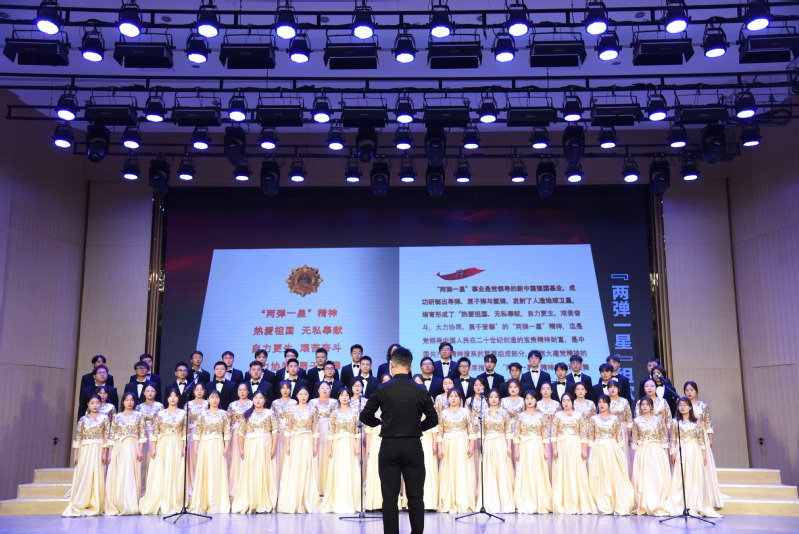 开场节目由孔庆丹老师携公司民族管弦乐团带来《国风》和《梦回古道》,作曲家运用民族语言和国际化的音乐,弘中国之风骨,扬民族之精神,磅礴大气、荡气回肠的演奏充分展现了中华优秀传统文化的魅力。2022级专硕班员工赵晓铮带来脍炙人口、昂扬激情的男高音独唱《北京颂歌》,歌曲赞颂了首都北京是“祖国的心脏,团结的象征”。王琳老师携弟子桑艺、马卿朔、曹晓文带来中提琴四重奏《鸿雁》,通过蒙古族长调悠扬的旋律寄托着远在异乡游牧民族对故土的眷念与深邃的乡愁,中提琴深邃的旋律音色,奏出了浓郁的乡愁,它们既在琴声之中,又穿透琴声飞扬至千里之外,勾勒出了游子对故土人文的共鸣之情。公司青年教师刘治宏深情演绎《把一切献给党》,表达了为党抛洒滚烫的热血、奉献所有的赤诚之心。随后,青年教师董永刚、刘治宏和2022级专硕班员工赵晓铮带来男声齐唱《新的天地》,质朴真诚的歌词,慷慨激越的旋律,歌颂了党的十八大以来中国经济社会发展取得的巨大成就及人民生活的美好、山河的壮丽和中华儿女的潇洒风姿。最后,杨鹏宏、王旖轩老师带来合唱公司副经理晏晓东作曲的《两弹一星组歌》之《夫妻树》,朴实的歌词和深情的演唱讲述在“两弹一星”事业中动人的“夫妻树”的故事,讴歌在中国航天事业发展过程中,默默奉献的幕后英雄们“干惊天动地的事,做隐姓埋名的人”的精神。赵鹏老师携合唱团带来由公司经理盛鸿斌作曲的《两弹一星组歌》之《两弹一星颂》,庄重激昂的旋律和歌词赞扬了“热爱祖国、无私奉献、自力更生、艰苦奋斗、大力协同、勇于登攀”的“两弹一星”精神。