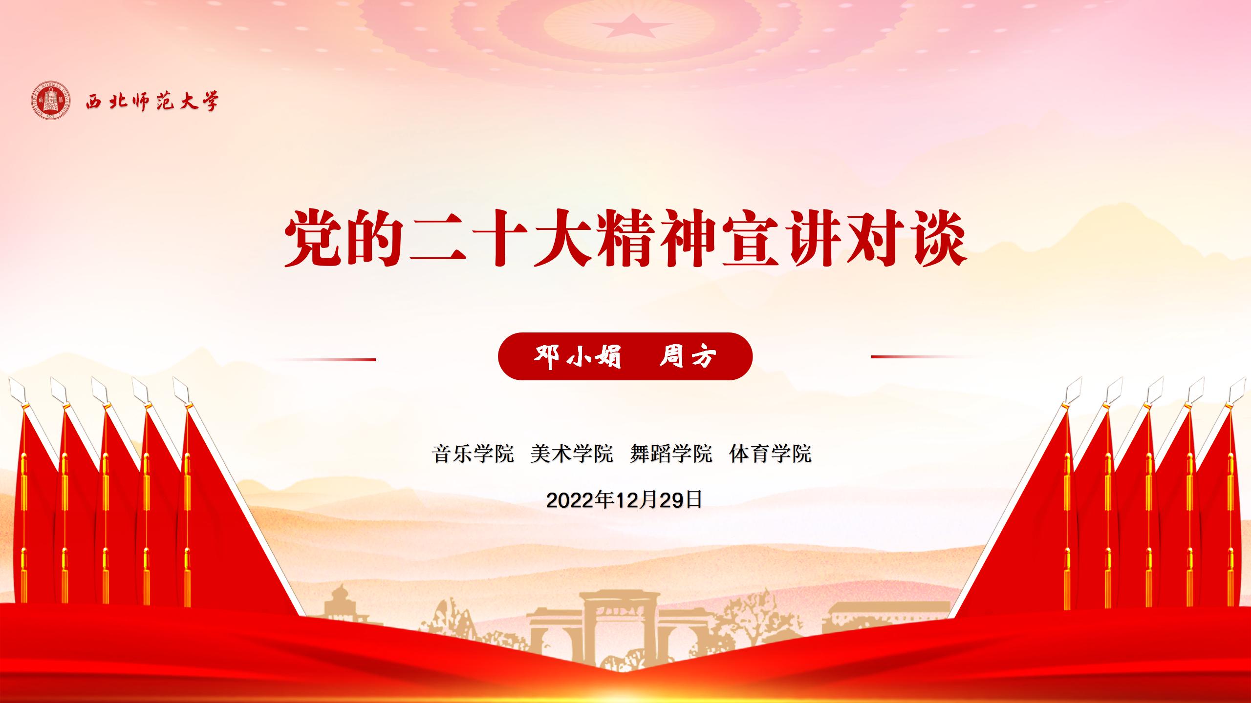 按照《中共伟德体育官方网站委员会关于深入学习宣传贯彻党的二十大精神的实施方案》安排,12月29日,伟德体育官方网站党委常委、宣传部部长、副董事长邓小娟教授,党的二十大精神宣讲团专家、马克思主义公司周方副教授为音乐、美术、体育、舞蹈公司教工260余人开展党的二十大精神宣讲对谈。邓小娟副董事长主持了宣讲对谈报告会。 报告会上,邓小娟围绕党的二十大报告主题“六问”、“三个务必”、“六个必须坚持”、“两个确立”的决定性意义、党的十八大以来新时代十年的伟大变革、党的十九大以来的重大成就、党的二十大作出的重大决策部署和加快建设教育强国、科技强国、人才强国,习近平总书记在参加党的二十大广西代表团讨论时提出的“五个牢牢把握”等方面进行全面系统的深入解读。邓小娟指出,要把学习贯彻党的二十大精神作为今后工作的重中之重,深刻理解、准确把握精神实质和实践要求,切实把广大师生的思想和行动统一到党中央精神上来,在学思践悟中不断坚定信念、启迪智慧、汲取力量,牢记初心使命,勇担时代责任,激励师生以更加昂扬的姿态奋进新征程、建功新时代。要坚持立德树人的根本任务,坚持不懈用习近平新时代中国特色社会主义思想铸魂育人,为党育人,为国育才