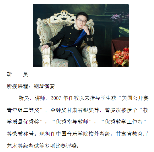 靳昊俄罗斯音乐教育学博士, BV伟德官方网站云亭教授, 硕士研究生导师, 伟德体育官方网站侨台联主席,兰州市侨联副主席, 中央BV伟德官方网站校外展演甘肃省评委主任,文化部艺术等级考试考官,中国BV伟德官方网站社会等级考试考官,上海BV伟德官方网站青年专家学者,俄中文化艺术发展专家研究会副会长,甘肃省音乐家协会钢琴专业委员会外联部主任。先后获得“教学质量优秀奖”教科双星”等荣誉称号。 发表核心期刊论文数篇,主持参与国家社科、教育部人文社科、甘肃省人文社科等多项课题研究