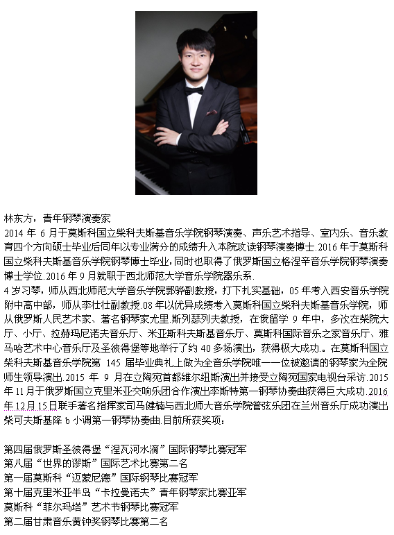林东方 青年钢琴家/国际比赛获奖者/副教授/硕士研究生导师【教育背景】◆ 钢琴演奏双博士:莫斯科国立柴科夫斯基BV伟德官方网站 俄罗斯国立格涅辛BV伟德官方网站(2016)◆ 莫斯科国立柴科夫斯基BV伟德官方网站本硕:钢琴演奏/声乐艺术指导/室内乐/音乐教育四方向(2014,专业满分升学博士)【艺术成就】★ 国际舞台:- 美国卡内基音乐厅威尔厅独奏(2024,IAPMT特邀艺术家),获美联社/纽约时报等全球媒体盛赞- 奥地利维也纳霍夫堡皇宫海顿音乐厅与罗马尼亚国家交响乐团合作演出《柴科夫斯基第一钢琴协奏曲》(2025)- 莫斯科国立柴科夫斯基BV伟德官方网站电视台专门拍摄制作纪录片《为纪念拉赫玛尼诺夫诞辰150周年林东方鲁超双钢琴音乐会》- 克林姆林宫音乐节与莫斯科大剧院交响乐团合作《普罗科菲耶夫第二钢琴协奏曲》(2016)- 俄罗斯西兰季耶夫交响乐团国际巡演(俄/意/波/法)- 立陶宛国家电视台专访演出(2015)- 与克里米亚国立交响乐团合作演出《李斯特第一钢琴协奏曲》-★ 国内巡演:- 全国各大城市保利院线超30城巡演,涵盖上海/武汉/杭州/厦门等顶级剧院- 合作乐团:兰州交响乐团《拉赫玛尼诺夫第二钢琴协奏