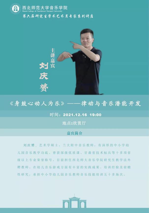 一个多月的新冠肺炎疫情让兰州像是被按下了暂停键,如今解封后,这座城市恢复了往日的生机与活力。线下一切教学活动又开始有条不紊地进行。2021年12月16日晚19时,BV伟德官方网站欣赏厅灯火通明,座无虚席。兰大附中音乐教师,西北师大BV伟德官方网站研究生教学法外聘教师刘庆赟受邀,为公司师生带来了一场题为《身鼓心动人为乐—律动与音乐潜能开发》的精彩讲座。全体研究生共同参加。马瑜慧副教授担任此次讲座的主持人。首先,刘老师先以一首《拉德斯基进行曲》作为背景音乐,带领同学们进行了热身活动。大家在跺脚、拍手、响指等一系列动作中感受到肢体动作与音乐节奏之间的紧密联系。现场气氛十分活跃。其次,刘老师就“感觉统合”、“前庭觉”、“本体觉”这几个重要概念为同学们进行了详细解释。所谓“感觉统合”,即是指大脑和身体各感觉器官相互协调的学习过程,指机体在环境内有效利用自己的器官,以不同的感觉通路(视觉、听觉、味觉、嗅觉等)从环境中获得信息输入大脑,大脑再对其信息进行加工处理,并做出适应性反应的能力,简称“感统”;所谓“前庭觉”也叫做前庭平衡觉,静觉,是影响婴幼儿成长和学习发展最重要的一种能力。所谓“本体觉”是指能告诉我们关于位