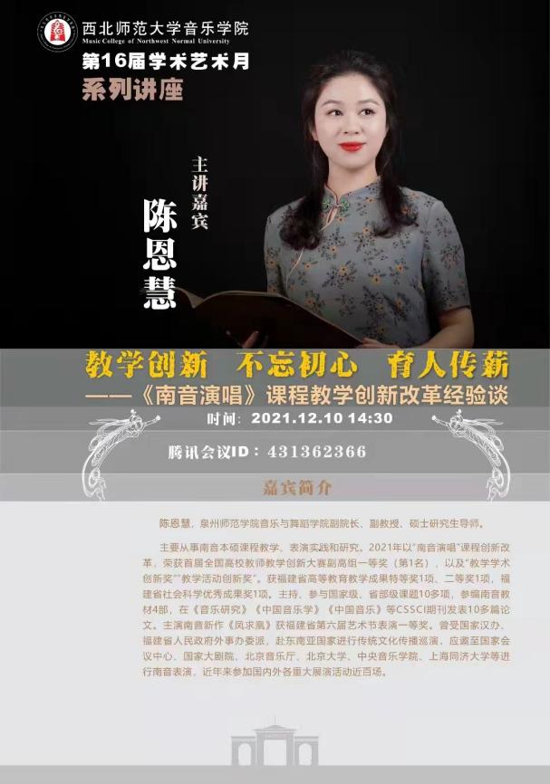 隆冬将至,第16届学术艺术月仍然开展得如火如荼。2021年12月10日下午14时30分,由泉州师范公司音乐与舞蹈公司副经理,副教授陈恩慧主讲的关于题为《教学创新,不忘初心,育人传薪——南音演唱课程教学创新改革经验谈》的讲座在腾讯会议上如期举行,全体师生共同参加。盛鸿斌教授担任本次讲座的主持人。南音,作为福建一个古老的地方性乐种,作为人类口头与非物质文化遗产,有着丰富、深厚的文化积淀。为进一步实现“古老南音”与“新教学理念”的有机融合,更好地培养服务于国家特殊需求的南音人才,真正实现“立德树人”的教育宗旨,《南音演唱》已成为泉州师范公司音乐与舞蹈公司的一门特色课程。本次讲座,陈恩慧老师主要从大赛精神和规则、课程性质和特征、教师个性和特长、材料和技术这四个部分为大家介绍了《南音演唱》这门课程的主要教学特色。首先,陈老师向大家介绍了南音演唱大赛的精神、规则、目标以及评审规则,通过比赛这一形式实现课程培养目标与教学创新改革,充分发挥大赛的示范引领作用与课程思政同向同行,精心打造高校教师教学创新标杆展示与交流平台。其次,陈老师向大家介绍了《南音演唱》课程的主要性质与特征。强调其主要以员工为本、以